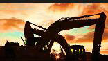 工地塔吊屹立繁華都市藍(lán)天白云襯景綠色環(huán)保工地在夕陽下的繁忙...