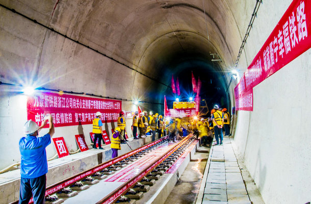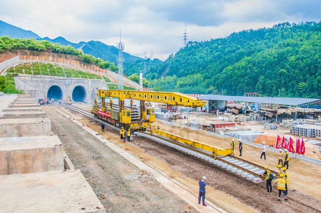 本站麗水訊(通訊員 王斌彥 逯平平) 5月12日下午15時58分,隨著鋪軌機牽引的最后一組500米長鋼軌在浙江段慶元縣菖蒲崗隧道緩緩就位并與福建段已鋪鋼軌精準對接,標志著由中鐵三局承建的衢寧鐵路浙江段正線鋪軌任務順利完成, 同時也標志著衢寧鐵路正線379.169公里鋪軌全線貫通,為該鐵路9月30日開通運營奠定了堅實基礎(chǔ)。