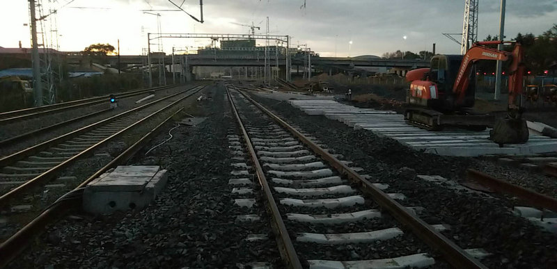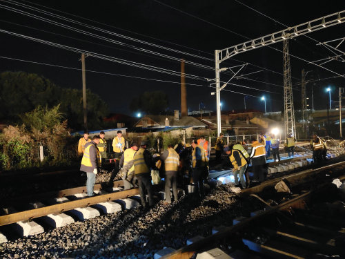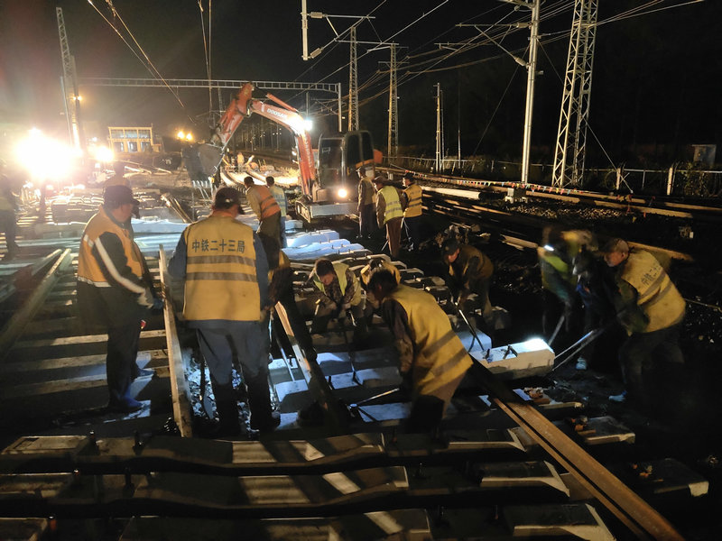 新建動(dòng)車存車場(chǎng)是客整所工程的重要組成部分,針對(duì)當(dāng)天的封鎖計(jì)劃,項(xiàng)目部召開專題會(huì)議,制定了詳細(xì)的作戰(zhàn)方案,配備了近百名施工人員,兩臺(tái)挖掘機(jī)、裝載機(jī)和一臺(tái)叉車,大到整體規(guī)劃,小到人員站位,超前預(yù)想,完善措施。二工區(qū)經(jīng)理吳佰峰提前半小時(shí)就組織施工人員到達(dá)現(xiàn)場(chǎng),22:00整,封鎖命令下達(dá)后,現(xiàn)場(chǎng)作業(yè)哨聲響起,工人們迅速上道,開始了緊張的操作。由于項(xiàng)目經(jīng)理袁正國、常務(wù)副經(jīng)理郭慶富、安全總監(jiān)費(fèi)亞臣始終在現(xiàn)場(chǎng)協(xié)調(diào)指揮,鼓舞了士氣,封鎖施工過程進(jìn)展順利。自動(dòng)車存車場(chǎng)開工以來,項(xiàng)目部采取分階段倒場(chǎng)過渡方案施工,圍繞現(xiàn)場(chǎng)環(huán)境組織精干力量,用方案指導(dǎo)現(xiàn)場(chǎng),班子成員包保監(jiān)控,力保新鋪和預(yù)鋪的各線順利推進(jìn),也為此次封鎖順利開通奠定了基礎(chǔ),更為按時(shí)兌現(xiàn)客整所節(jié)點(diǎn)提供了保障。