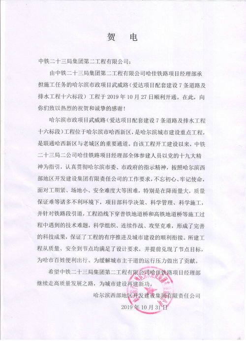 11月9日,中鐵二十三局二公司哈佳鐵路項目部收獲了哈爾濱西部地區(qū)開發(fā)建設集團有限責任公司發(fā)來的賀電,祝賀承建的哈爾濱市政武威路工程的正式開通。