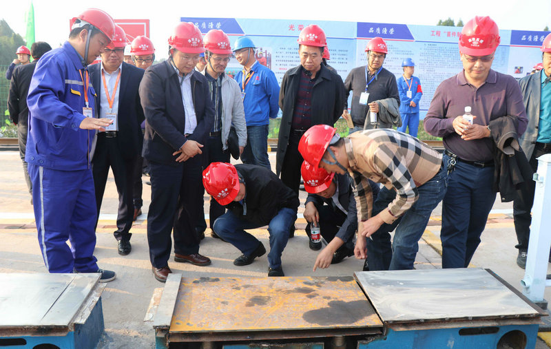 重慶交通委總工程師李關(guān)壽對(duì)梁場職工創(chuàng)新預(yù)制件支座調(diào)整器給以高度贊揚(yáng)