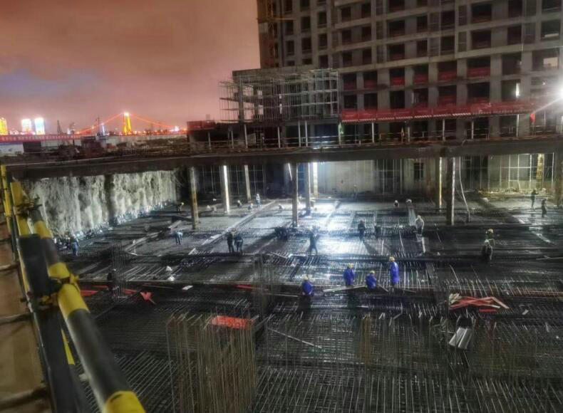 中鐵十八局集團(tuán)北京工程有限公司承建的“國(guó)鐵·印江瀾”項(xiàng)目地下室夜間施工現(xiàn)場(chǎng)(李金龍攝)