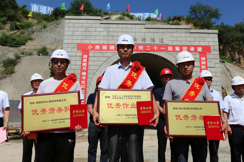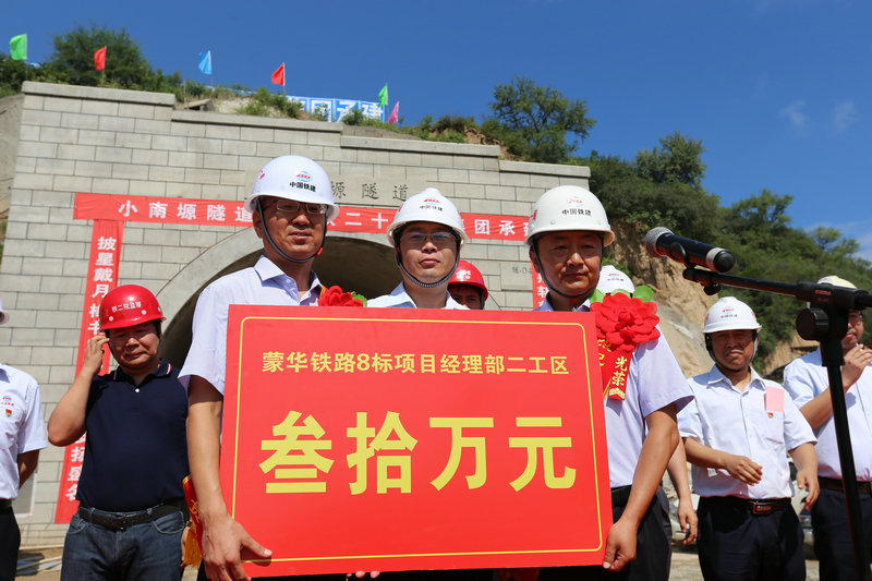 根據(jù)慶典議程安排,首先由8標(biāo)項(xiàng)目部副經(jīng)理王志貴致辭,然后由常務(wù)副經(jīng)理、總工李福成介紹小南塬隧道施工情況。蒙西華中鐵路蒙陜指揮部副總工程師王俊勝宣讀賀電、中鐵二院監(jiān)理公司蒙華鐵路項(xiàng)目部總監(jiān)羅建偉致辭。接下來,8標(biāo)項(xiàng)目部質(zhì)量總監(jiān)王武高宣讀了《關(guān)于對小南塬隧道貫通進(jìn)行獎(jiǎng)勵(lì)的決定》、副經(jīng)理呂劍宣讀了《關(guān)于表彰小南塬隧道施工“優(yōu)秀作業(yè)隊(duì)”、“優(yōu)秀勞務(wù)隊(duì)”的決定》,承建小南塬隧道的蒙華二工區(qū)獲獎(jiǎng)30萬元。中鐵二十一局集團(tuán)公司副總經(jīng)理、項(xiàng)目經(jīng)理馮建軍在講話中,對小南塬隧道順利貫通表示熱烈祝賀,對在施工中作出突出貢獻(xiàn)的二工區(qū)員工表示誠摯的感謝,希望參建員工繼續(xù)努力,為奪取蒙華鐵路施工的最后勝利再立新功。