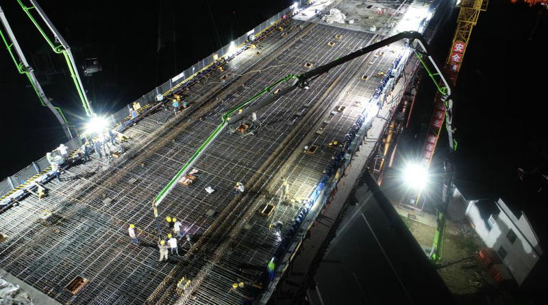 由于澆筑過程不能中斷,需要數(shù)十小時連續(xù)作業(yè),該項目精準施策,采用“兩班倒”與“白+黑”的安排,兩班人員相互配合、輪番上場,奮戰(zhàn)攻堅,終于順利完成合龍。