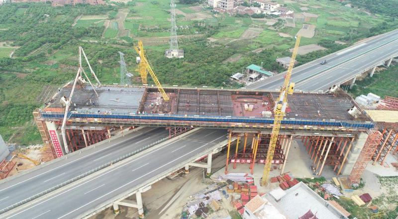 此次合龍段位于梅山特大橋24-25號墩,采用1-112米提籃拱跨越既有莆永高速公路岐厝高架橋,與高速公路斜交39度,系梁全長116米,橋面寬19米。