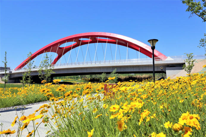由中鐵廣州局市政環(huán)保公司承建,位于陜西西咸新區(qū)灃西新城中部浪漫新地標(biāo)豐耘橋,如一道靚麗的彩虹,飛架于風(fēng)景秀麗的中心綠廊濕地公園之上。豐耘橋是一座紅色拱橋,象征著愛(ài)情的熱烈,橋體全長(zhǎng)約399米,為提籃式系桿拱橋設(shè)計(jì),完美的流線設(shè)計(jì),寓意愛(ài)情長(zhǎng)長(zhǎng)久久、順順利利,與心愛(ài)的人攜手走到豐耘橋上,感受漫地花海的圍繞,只會(huì)想到愛(ài)情的甜蜜,會(huì)更加深?lèi)?ài)對(duì)方,這將會(huì)是愛(ài)情中一次浪漫的經(jīng)歷,只有攜手共同走過(guò)、經(jīng)歷過(guò),愛(ài)才會(huì)越濃烈,經(jīng)歷了酸甜苦辣,真愛(ài)才會(huì)更加長(zhǎng)久