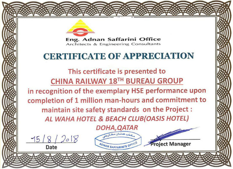 本站天津訊(孫太東 劉曉東 姜凡菲)近日,中鐵十八局集團國際公司卡塔爾綠洲酒店項目累計百萬工時無事故,獲得監(jiān)理單位頒發(fā)的“百萬工時零事故”的安全生產(chǎn)獎狀。