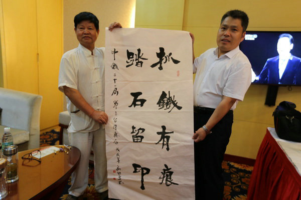 老戰(zhàn)士、公安縣文聯(lián)主席、書(shū)法家劉世平為了表達(dá)對(duì)48團(tuán)娘家人的深情厚意和感謝他們?yōu)楣踩嗣裥迾蜾伮匪鞯呢暙I(xiàn),不停地現(xiàn)場(chǎng)揮毫潑墨,為大家贈(zèng)送蒼勁有力、功力深厚、具有收藏價(jià)值的字畫(huà)。老戰(zhàn)士賀正海退伍后,成為公安縣一名實(shí)力雄厚的知名企業(yè)家,賀總在祝酒致辭中道出了肺腑之言:“感謝老部隊(duì)、老單位為公安人民建成了高質(zhì)量、高標(biāo)準(zhǔn)的橋梁,極大地改善了全縣的交通狀況,方便了群眾出行。”他說(shuō),中鐵二十一局三公司公安四橋項(xiàng)目部在公安縣架起了五座橋梁,其中一座是公安籍鐵道兵48團(tuán)老戰(zhàn)友與中鐵二十一局三公司之間聯(lián)系的橋梁。