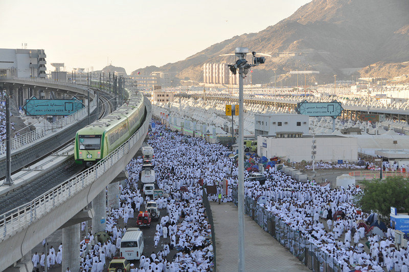 朝覲期間,列車行駛在中鐵十八局集團(tuán)承建的麥加輕軌上
