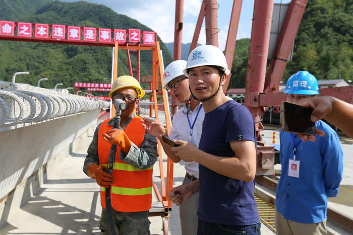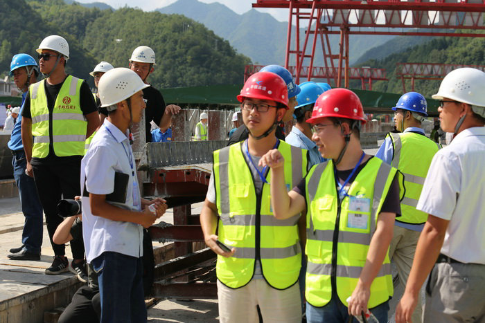在參觀制梁施工中,盡管氣溫很高,曬得人汗流浹背,但觀摩人員卻忘情投入,看的十分仔細(xì)。干凈整潔,規(guī)模宏大的現(xiàn)代化制梁場令人耳目一新。在鋼筋綁扎機(jī)現(xiàn)場,很多觀摩人員親自體驗。在噴淋養(yǎng)生系統(tǒng)、梁場鋼筋安裝移動推拉式遮雨棚、梁板濕接縫、端頭橫梁接頭手持式混凝土鑿毛機(jī)操作現(xiàn)場,觀摩人員不停詢問,副經(jīng)理暴林一一作答。很多人拿出手機(jī)拍照錄相,記錄制梁施工過程。當(dāng)記者問18標(biāo)江西路橋常務(wù)副經(jīng)理張小剛的觀摩感受,他說:“17標(biāo)制梁場規(guī)模宏大,工藝先進(jìn)、設(shè)備先進(jìn),這才是真正的標(biāo)準(zhǔn)化施工,看了令人震撼。中鐵二十一局三公司是央企,我們沒法比啊。”旁邊一位帥氣的監(jiān)理接過話說:“那你們要加油??!”