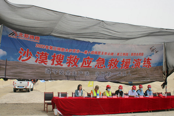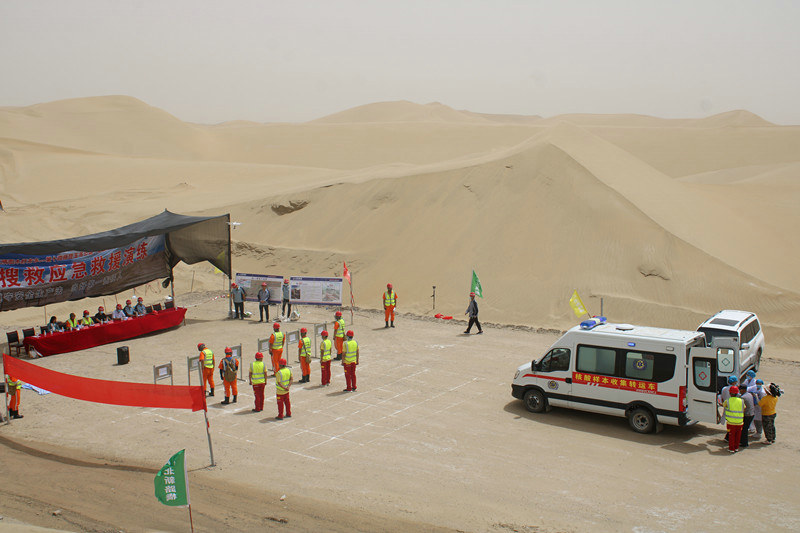 為給沙漠人員走失及高溫中暑情況下夯實基礎(chǔ),沙漠施工作業(yè)開個好頭,北新路橋圖昆公路項目第四標段管理團隊與第三師建設(shè)項目建管處緊密配合,在演練程序和細節(jié)上作了周密規(guī)劃和籌備。