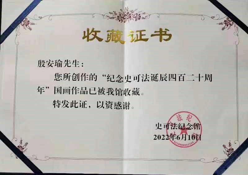——今年是民族英雄史可法誕辰420周年。史可法與岳飛、文天祥齊民的民族英雄。他為捍衛(wèi)民族尊嚴(yán),浴血奮戰(zhàn),舍身忘死,他的事跡動(dòng)天地,泣鬼神是江蘇揚(yáng)州這座城市豐碑和英雄底色。由揚(yáng)州市文化廣電和旅游局、揚(yáng)州市文聯(lián),江蘇史可法紀(jì)念館,揚(yáng)州市美術(shù)家協(xié)會(huì)、揚(yáng)州書法家協(xié)會(huì)共同舉辦的紀(jì)念史可法誕辰420周年書畫作品征集活動(dòng),我的國(guó)畫作品獲獎(jiǎng),并被史可法紀(jì)念館永久收藏!