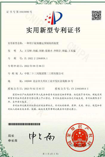 隨著近日一項實用新型專利證書的到來,由中鐵二十三局集團(tuán)二公司深圳外環(huán)高速公路項目部去年向國家知識產(chǎn)權(quán)局申報的三項國家專利申請已經(jīng)全部獲得批準(zhǔn)。