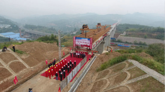 近日,中鐵建大橋工程局五公司施工的陽大鐵路項目部舉行了架梁貫通儀式,慶祝陽泉北至陽泉東432片T梁架設任務圓滿完成,這一任務的完成,標志著陽大鐵路全面鋪軌工程正式拉開了施工序幕。