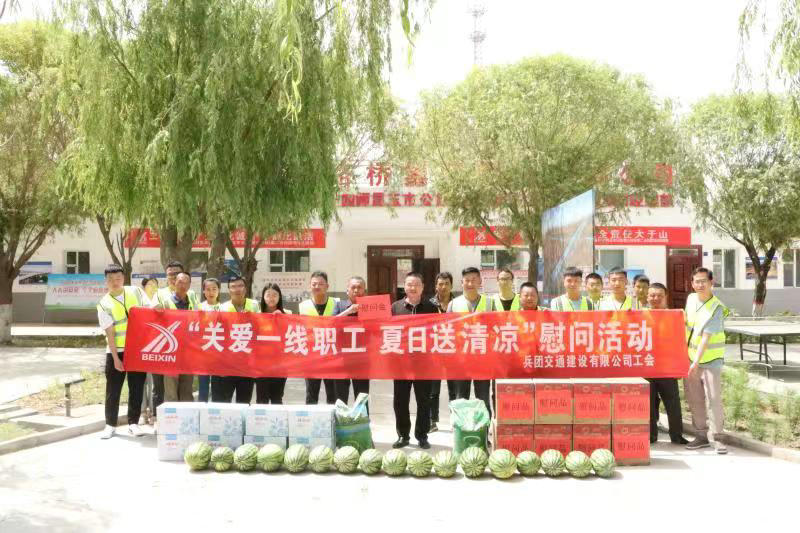 圖木舒克訊(通訊員 皇甫秉淑)近日,圖木舒克高溫炎熱天氣持續(xù),烈日炙烤著一線施工人員,也牽動(dòng)著公司領(lǐng)導(dǎo)的心。6月13日上午,公司黨委副書記、總經(jīng)理趙睿龍赴新疆北新路橋集團(tuán)圖木舒克子公司所屬項(xiàng)目開展“關(guān)愛一線職工 夏日送清涼”慰問活動(dòng),去施工現(xiàn)場(chǎng)看望慰問一線職工,將防暑降溫藥品、西瓜、礦泉水、綠豆等送到職工手中。