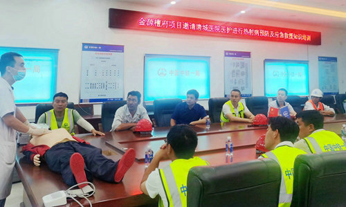(西安訊)7月8日,金源檀府項目部邀請未央?yún)^(qū)唐城醫(yī)院醫(yī)護人員到項目為一線工人普及應急救援及熱射病預防知識,為項目“高溫模式”下安全生產助力。這是中鐵一局建安公司西安建筑分公司各在建項目在炎炎夏日為保護一線作業(yè)人員安全,提升自我防護和應急救援能力而開展的一項工作的縮影。