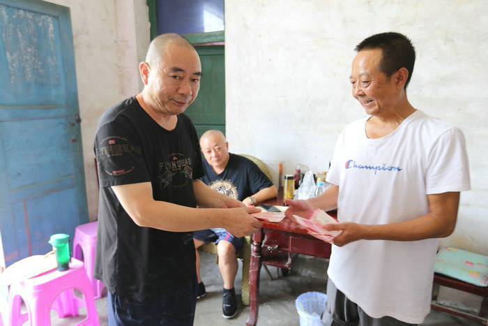圖為會長李偵榮(右)慰問朱世文 朱世文的家位于鄉(xiāng)村公路旁邊,需要上一個20多米長的陡坡才能進入院落,抬頭一看,雖然房屋是一樓一底的小青瓦房,但墻壁剝落,十分簡陋,除了墻上掛的一臺20英寸的小電視外,屋內沒有一件象樣的家具。據朱世文介紹,這小青瓦房屋建于1997年,到現在已是破敗不堪。