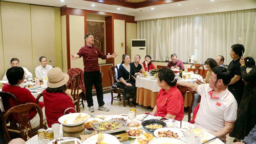 簡單休息后,晚餐在全聚德烤鴨店(玉泉路店)就餐。負(fù)責(zé)“鐵色之旅”活動接待的北京團(tuán)隊成員閃亮登場——陳朝凱、李雅君、孫建敏等還分別指定了專人陪同進(jìn)京參與“鐵色之旅”活動的戰(zhàn)友。席間,賈珍、仇彥玲、陳朝凱、羅光明、梅梓祥等盡情發(fā)揮,除即席清唱了歌曲,還回顧和研討了鐵道兵兵種在消失幾十年的今天,鐵道兵的戰(zhàn)友之情何以能歷久彌新?
