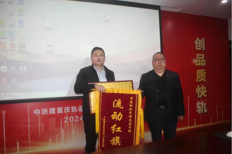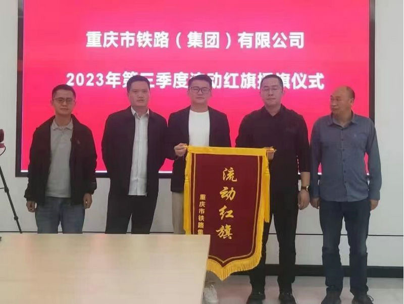 2023年項(xiàng)目經(jīng)理阮超(右2)接受重慶市鐵路集團(tuán)授予項(xiàng)目部“文明施工流動(dòng)紅旗”,迄今年為止保持兩年冠