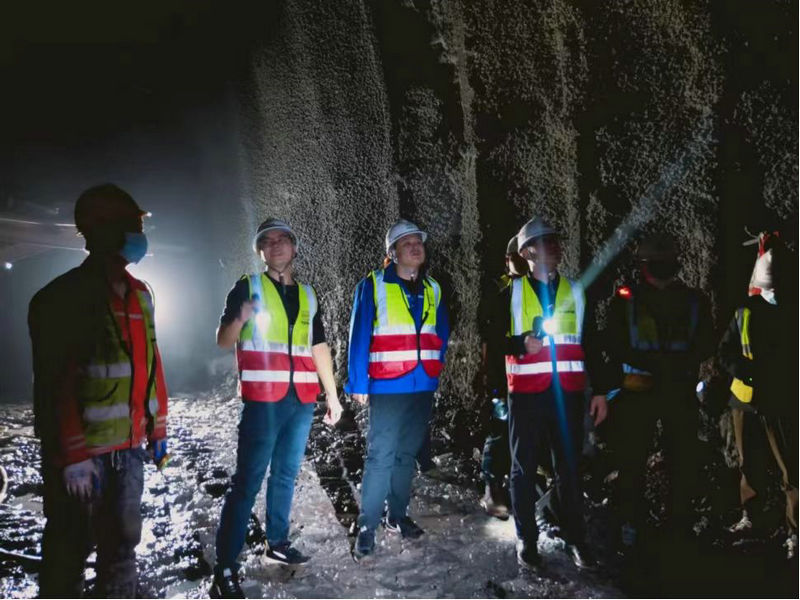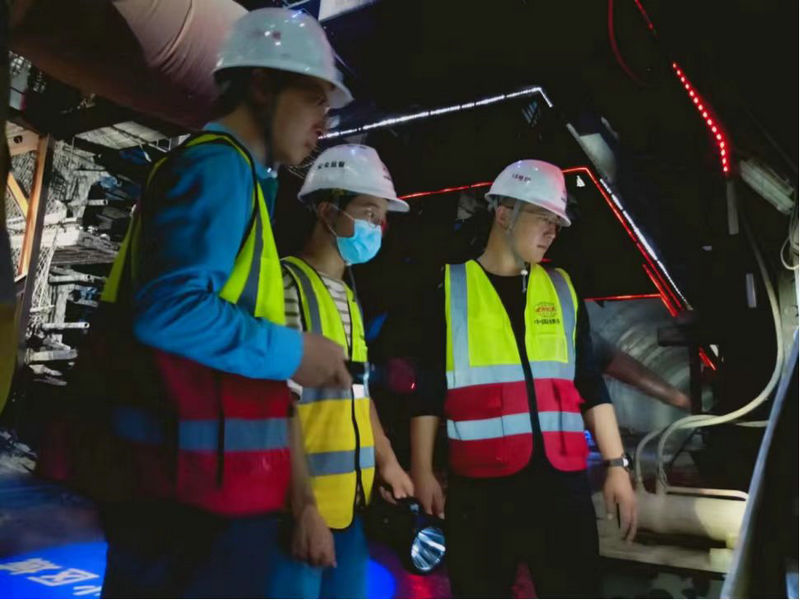 項(xiàng)目部經(jīng)理阮超(右1)書記韓崇生(右2)帶班在中梁山隧道進(jìn)口掌子面夜查