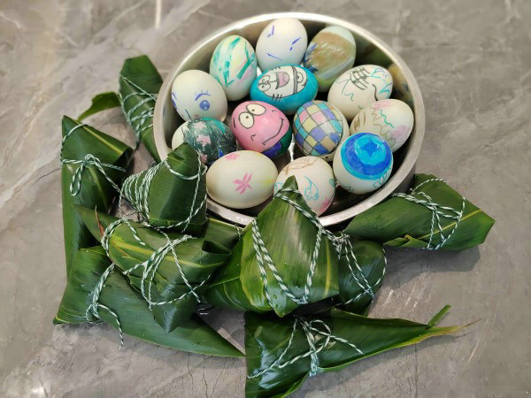 另一邊,職工們正聚精會(huì)神地在咸鴨蛋上繪制圖案,有的畫上自己喜歡的卡通人物彰顯著自己的青春個(gè)性,有的天馬行空腦洞大開進(jìn)行抽象主義創(chuàng)作,有的則畫上寓意平安喜樂的花紋和圖案,寄托著對(duì)端午節(jié)“平安喜樂、國泰民安”的美好愿望。