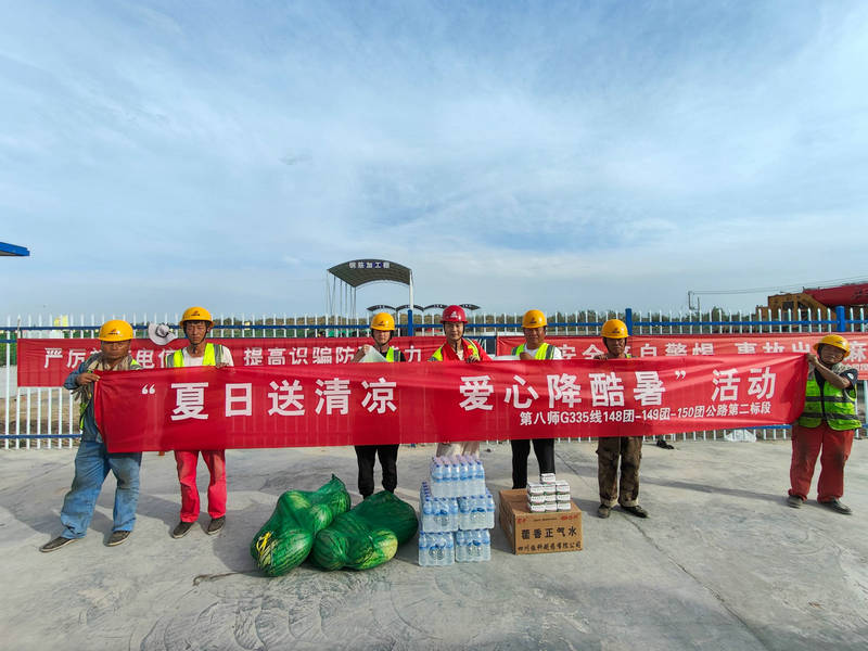石河子訊(通訊員 李宇通)為切實(shí)維護(hù)好高溫期間現(xiàn)場(chǎng)工人的身體健康,改善其生產(chǎn)生活條件,做好防暑降溫關(guān)懷,保障項(xiàng)目生產(chǎn)過(guò)程中的安全與健康,近日,北新路橋集團(tuán)兵團(tuán)交建公司第八師G335二標(biāo)項(xiàng)目開(kāi)展了“夏日送清涼 愛(ài)心降酷暑”活動(dòng)。