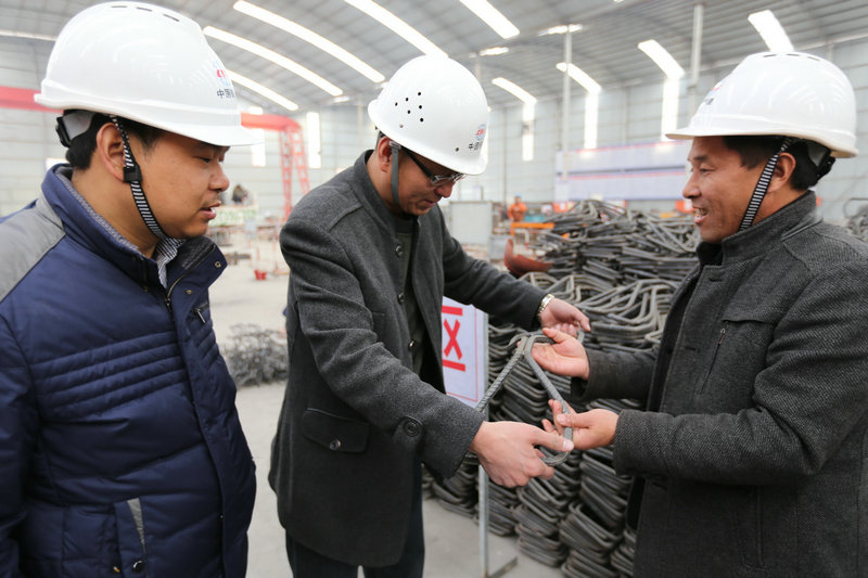 馬小利向項目經(jīng)理、項目總工介紹“8”字筋加工情況