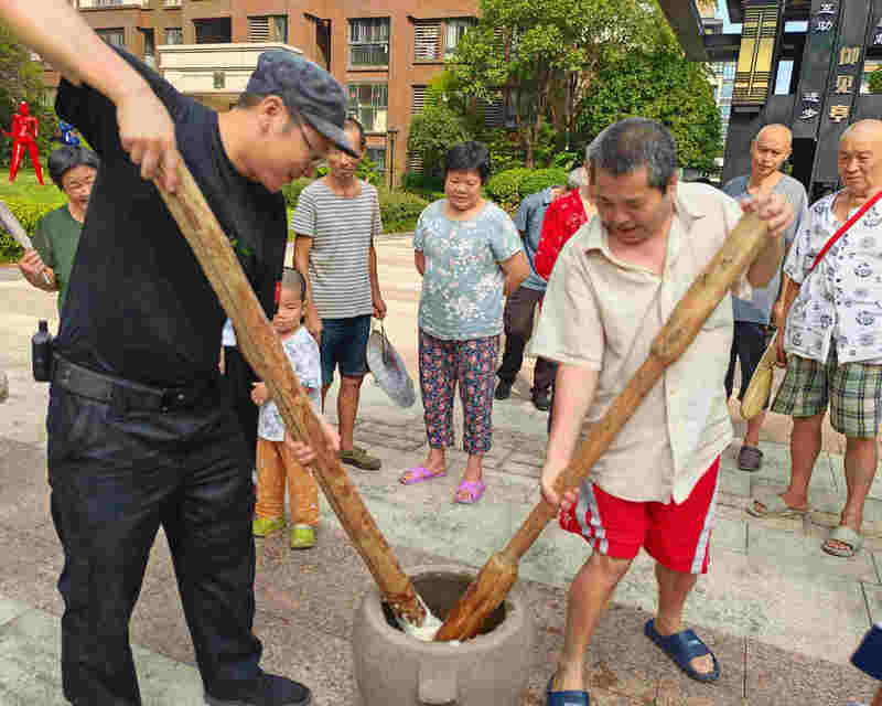 同時(shí),二街區(qū)中庭外舂糍粑活動(dòng)也同步開始,業(yè)主們把自己蒸好的糯米倒進(jìn)物業(yè)準(zhǔn)備的碓窩里,業(yè)主兩兩一組,手持木錘有序進(jìn)行打糍粑,不到一會(huì)兒,在大家的齊心合作下,碓窩中的糯米就變成了香甜的糍粑,大家伙兒吃著舂好的糍粑有說有笑,其樂融融,更將節(jié)日氣氛推向高潮。
