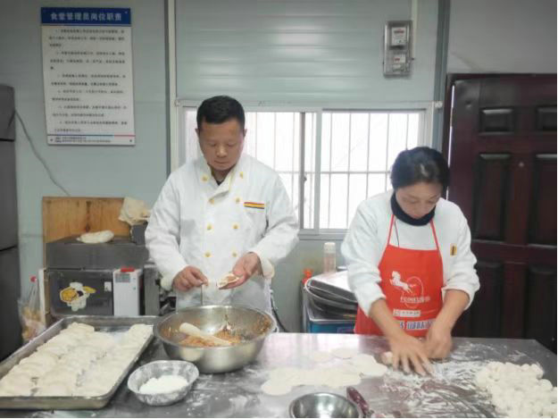 【項(xiàng)目部廚師田慶雷、江偉麗為員工做青島特吃早餐鍋貼】