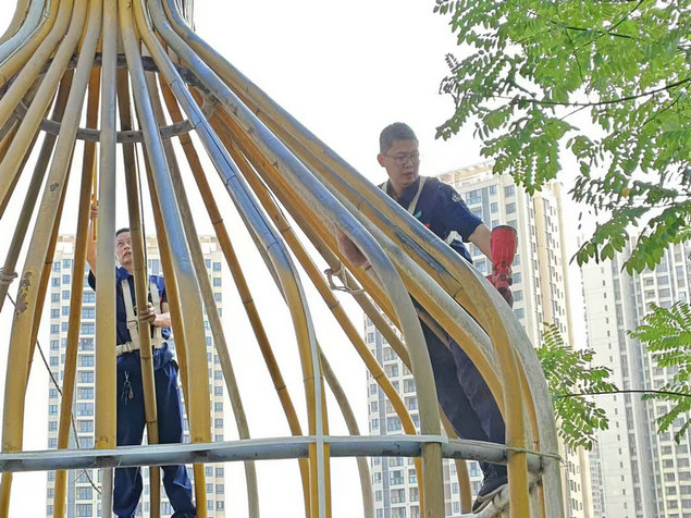 然而,經(jīng)過一段時間的風(fēng)吹日曬,“鳥巢”建筑出現(xiàn)了銹蝕現(xiàn)象,這不僅影響了其美觀度,也對其結(jié)構(gòu)的穩(wěn)定性帶來了一定的隱患。宜邦物業(yè)公司高度重視,迅速組織維養(yǎng)部對其制定詳細(xì)維護(hù)方案。通過現(xiàn)場勘查,對銹蝕程度和范圍進(jìn)行準(zhǔn)確評估,在不損壞建筑結(jié)構(gòu)的前提下,將銹蝕部分徹底清除;在刷漆方面,保證漆層的牢固度和美觀度,為“鳥巢”建筑穿上嶄新且持久的“保護(hù)衣”。經(jīng)過維養(yǎng)部工作人員們的辛勤努力,“鳥巢”建筑再次以嶄新的面貌呈現(xiàn)在人們面前。獨(dú)特的造型在陽光下熠熠生輝,為龍脊山公園增添了一道亮麗的風(fēng)景線。