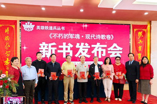 在出席新書發(fā)布會現(xiàn)場近百人的鐵道老兵、學(xué)兵、軍嫂和鐵二代的見證下,文創(chuàng)中心常務(wù)副主任、英雄鐵道兵叢書副總編、該書編委王林山戰(zhàn)友宣布新書揭幕?,F(xiàn)代詩歌卷主編李汪源;中國電影文學(xué)會常務(wù)理事、國家二級教授韓志晨;英雄鐵道兵叢書總策劃、著名詩人劉勝(遠(yuǎn)方);英雄鐵道兵叢書副總編鄭建平;軍嫂代表、鐵粉陳淑娟共同為《不朽的軍魂·現(xiàn)代詩歌卷》揭幕,霎時(shí),會場響起經(jīng)久不息的熱烈掌聲……
