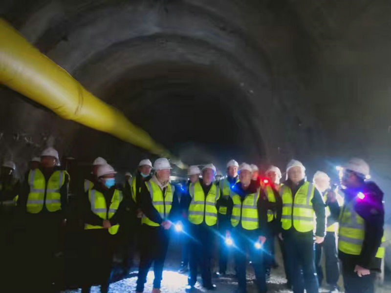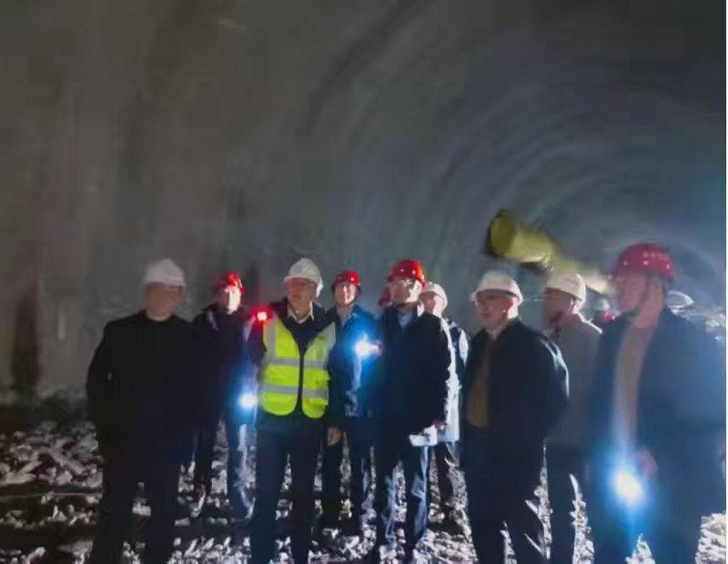 總承包部指揮長(zhǎng)李兵(前排右二)、項(xiàng)目部經(jīng)理阮超(前排左二)在中梁山隧道進(jìn)口掌子面檢查指導(dǎo)