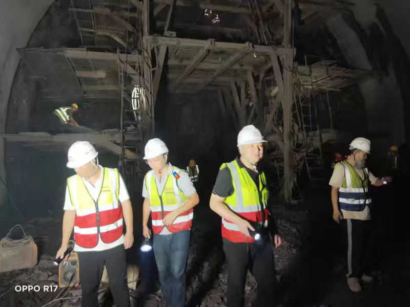 項(xiàng)目書(shū)記韓崇生(右二)帶班深入中梁山隧道進(jìn)口掌子面履行“黨員干部安全質(zhì)量監(jiān)督崗”夜查制度