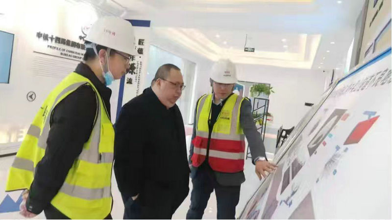 項目部經(jīng)理阮超(右)總工李文慶(左)向總承包部指揮長李兵(中)匯報中梁山隧道質(zhì)量和安全受控情況
