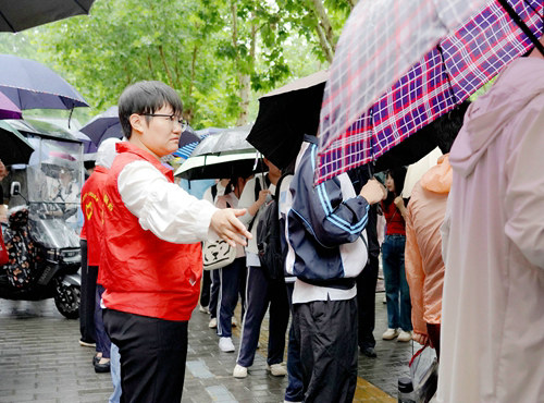 7日清晨,因雨水天氣,在社區(qū)的統(tǒng)一安排下,志愿者們迅速在學(xué)校門口搭建了應(yīng)急愛(ài)心助力志愿服務(wù)點(diǎn),為考生和等待的家長(zhǎng)們提供遮風(fēng)擋雨的地方,同時(shí)為考試和家長(zhǎng)提供礦泉水、應(yīng)急文具、休息板凳等。待考生進(jìn)入考場(chǎng)后,志愿者主動(dòng)邀請(qǐng)家長(zhǎng)進(jìn)入帳篷下避雨,與家長(zhǎng)們聊及高考注意事項(xiàng),緩解家長(zhǎng)的焦慮心情。過(guò)程中,志愿者們積極協(xié)助太乙路辦事處維持考場(chǎng)外紀(jì)律秩序,文明引導(dǎo)行人和車輛停放秩序,全力保障考點(diǎn)周邊環(huán)境。考試結(jié)束,志愿者們?yōu)槲磾y帶手機(jī)的考生提供電話服務(wù),幫助及時(shí)聯(lián)系家長(zhǎng),節(jié)約考生時(shí)間,做好充足午休,為下一場(chǎng)考試做好充分準(zhǔn)備。青年志愿者們高度的責(zé)任感和熱情的服務(wù)態(tài)度,成為西安市鐵一中考場(chǎng)外一道亮麗的風(fēng)景線。
