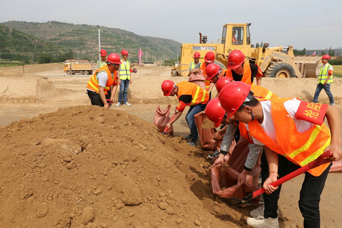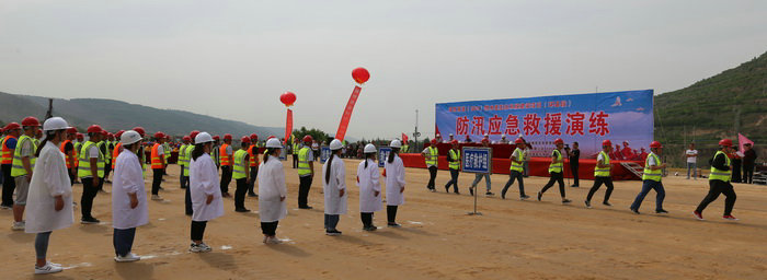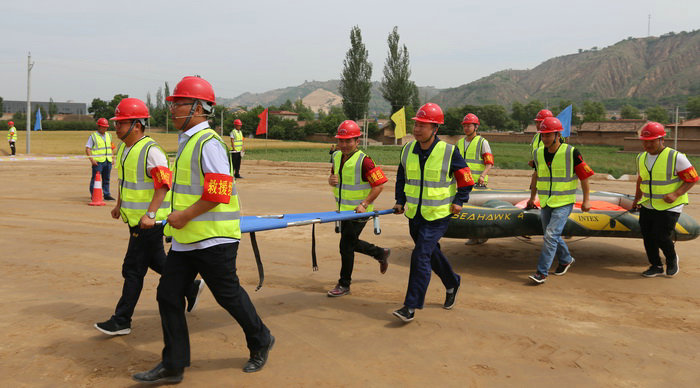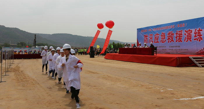 各演練小組奔赴崗位 防汛演練總指揮由甜永高速環(huán)縣段項(xiàng)目辦副主任趙金海擔(dān)任,副總指揮由中鐵二十一局三公司甜永高速9標(biāo)副經(jīng)理白永喜擔(dān)任。直接參與演練的人員達(dá)到70多人,全線13個(gè)土建標(biāo)段、6個(gè)監(jiān)理標(biāo)段、2個(gè)試驗(yàn)標(biāo)、2個(gè)控制標(biāo)、7個(gè)路面標(biāo)共30個(gè)標(biāo)段的安全負(fù)責(zé)人、項(xiàng)目負(fù)責(zé)人到現(xiàn)場(chǎng)觀摩,附近群眾在劃定區(qū)域外觀看,總?cè)藬?shù)達(dá)到360多人。慶城縣應(yīng)急管理局副局長梁建榮應(yīng)邀親臨現(xiàn)場(chǎng)觀摩,慶城縣人民醫(yī)院派出醫(yī)護(hù)人員和120急救車參加演練。