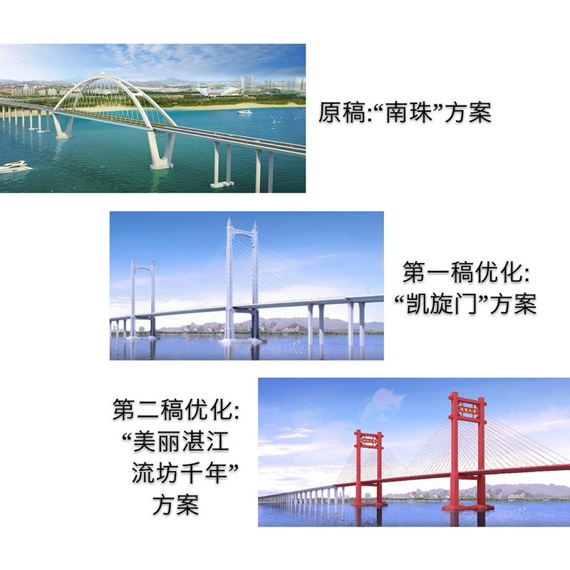調順跨海大橋的設計方案優(yōu)化工作可謂一波三折,早在2014年,湛江市就向市民公開征集對主橋外觀方案的意見,最終體現(xiàn)湛江地域文化風采和精髓的“南珠”方案從“湛江龍”、“花開福地”、“南珠”、“揚帆”、“碧海纖云”、“湛海飛虹”等六個設計方案中脫穎而出。2017年初,國內建橋勁旅中鐵大橋局中標調順跨海大橋PPP項目,在同年7月份的PPP簽約大會后,湛江市醞釀對主橋方案進行優(yōu)化調整,并責成湛江市交投集團盡快拿出新方案,以期順暢銜接施工建設,避免造成工期延誤。但是優(yōu)化方案幾經調整,三易其稿,對項目融資和施工建設均造成了不同程度的影響。一直到今年6月20日何鏡堂大師團隊“風調雨順,湛江紅門”為主題的深化方案新鮮出爐,才使得為期近一年的主橋優(yōu)化設計方案最終塵埃落定。