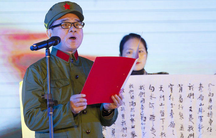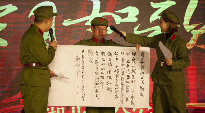 首先由來自西安的學兵張群芳、葉維娜、徐慧、任萱、王淑玲、李爽6人表演開場舞《最美是你》,一襲紅色的長裙,靈活的身段、輕盈的舞姿贏得了熱烈的掌聲,將文娛演出推向了第一個高潮。隨后,由原鐵道兵第十師48團汽車二連指導員、團湖北省委副書記、湖北省青年聯(lián)合會主席楊澤林會長致辭、汪正茂副會長講話、鐵道兵二師戰(zhàn)友聯(lián)誼會秘書長張集臣致賀詞、原50團機關電影組、湖南常德鐵道兵十師戰(zhàn)友聯(lián)誼會會長勞新國講話、荊州市沙市鐵道兵第十師48團戰(zhàn)友聯(lián)誼會副會長兼秘書長劉昌林講話。接下來由慶典公司人員王軍演唱《當兵的人》;原48團汽車連老戰(zhàn)友肖文斌詩朗誦《我們是鐵道兵》;原48團10連文書劉世平戰(zhàn)友同時現(xiàn)場表演書法;西安學兵李爽、王淑玲女聲演唱《大紅棗兒甜又香》;原48團宣傳隊戰(zhàn)友沈方茂板胡獨奏《春來早》;女聲獨唱《節(jié)日歡歌》,表演者王淑玲;男女聲二重唱《為了誰》,表演者原48團宣傳干事張運茂、西安女學兵王淑玲。