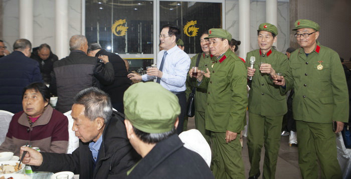 會務組領導向戰(zhàn)友們敬酒 12點20分,演出結(jié)束后,工作人員安排全體戰(zhàn)友及家屬在酒店用餐。會長楊澤林、執(zhí)行會長賀正海、副會長楊德榮、副會長汪正茂、秘書長張永華等向全體戰(zhàn)友致祝酒詞并敬酒,祝賀參軍50周年慶典聯(lián)誼會取得圓滿成功!并希望戰(zhàn)友們保重身體,老有所樂,愉快地生活,安享晚年!在熱烈的掌聲中,老戰(zhàn)友們舉杯歡慶,希望明天更美好!