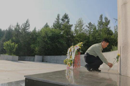 圖五、革命烈士紀(jì)念碑前擺放花藍,緞帶上書寫著“鐵道兵英雄永垂不朽”