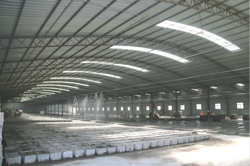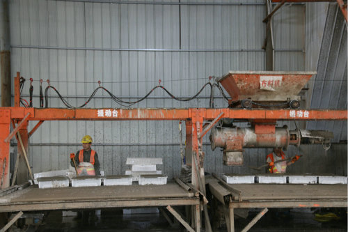 圖二、布料振搗 “咱們的小型預制件場通過一臺1000型拌合機和兩臺上行式軌道布料器,雙向同時給四個模具布料,大幅提高砼的入模速度;在四個大功率、大平臺組成的自行式振動臺上,自動滾軸式托盤與叉車配合生產(chǎn),模具的振搗和轉(zhuǎn)運全部是機械自動化,減少了10個人工,整個項目下來,能節(jié)約50多萬元的成本。”由維健自豪地向湯建偉繼續(xù)講解,“為了確保預制構(gòu)件的質(zhì)量,在養(yǎng)生環(huán)節(jié),咱們采用了全自動信息化噴淋養(yǎng)生系統(tǒng),分區(qū)域、分階段對預制塊進行養(yǎng)護,更利用網(wǎng)絡和手機終端進行實時監(jiān)控,杜絕了人為因素造成的養(yǎng)生不到位。使用過的模具集中到振動臺旁邊的清洗池,統(tǒng)一清理后再布料振搗,整個流水線就這樣在場內(nèi)全部完成。”