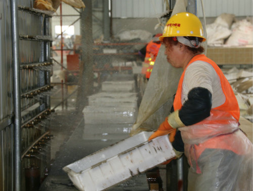 圖四、清洗模具 據(jù)悉,中國鐵建大橋局西北公司京藏改擴建路面1標小型預制件場的生產(chǎn)任務多達32556.69 立方米,132萬塊,主要為路面排水槽、空心六棱磚、實心六棱磚、拱形骨架、方格、護肩板,急流槽、縱向排水溝等。通過流水線施工作業(yè),日均生產(chǎn)量可達到90~100立方米,最多時可達到117立方米,比業(yè)主要求的日均生產(chǎn)量多了近40立方米。