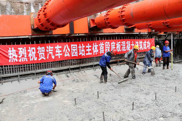 汽車公園站首段底板需要打入混凝土795m³,員工們發(fā)揚鐵軍連續(xù)作戰(zhàn)的精神,他們冒著毛毛細(xì)雨晝夜奮戰(zhàn),經(jīng)過大伙20多個小時的頑強拼搏,終于圓滿完成了這項艱巨的任務(wù)。首段底板混凝土的澆筑成功,為下步其它各項工序的施工打下了堅實的基礎(chǔ)。