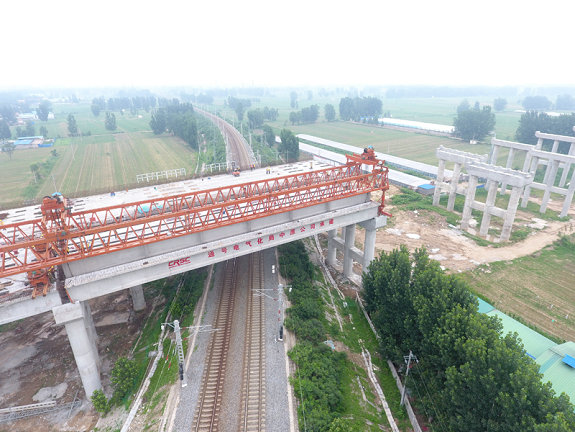 臺輝高速跨瓦日鐵路工程K110橋作為范臺梁高速公路的重要一環(huán),位于臺前縣后方鄉(xiāng)大寺郭村西北側(cè)、東王坊村南側(cè),瓦日鐵路范縣至臺前區(qū)間內(nèi),道路與鐵路交角65度,交叉處道路位于左偏圓曲線上,上部結(jié)構(gòu)采用50米先簡支后連續(xù)預(yù)制T梁。自6月9日至7月2日,連續(xù)要Ⅱ級點16個,過孔2次,安全完成T梁架設(shè)14片。