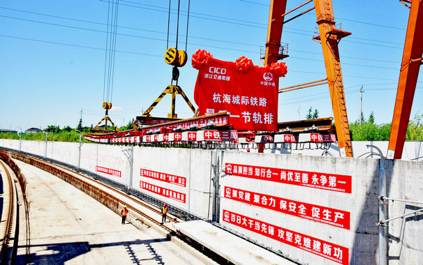 杭州至海寧城際鐵路,又稱杭州地鐵海寧線,沿線經(jīng)過了杭州市余杭區(qū)(南苑街道)、許村鎮(zhèn)、長安鎮(zhèn)、周王廟鎮(zhèn)、鹽官鎮(zhèn)、斜橋鎮(zhèn)、海寧主城區(qū),線路總長約48.18千米,共設(shè)站13座。杭海城際鐵路的建成對發(fā)揮都市圈同城效應(yīng),打造融杭"一小時(shí)通勤圈",推動(dòng)城鎮(zhèn)一體化發(fā)展,構(gòu)建"立體式"綜合交通走廊起到重要作用。中鐵三局線橋公司承擔(dān)34.56千米鋪軌任務(wù)及相關(guān)工程,橫跨余杭高鐵站至長安鎮(zhèn)站3站2區(qū)間,設(shè)海長區(qū)間置U型槽和余許區(qū)間2處鋪軌基地,