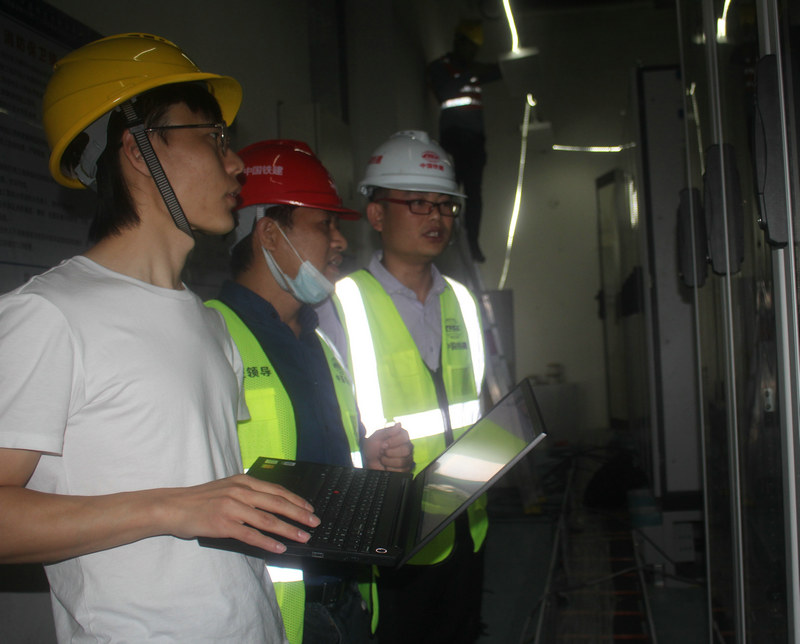 五工區(qū)副經(jīng)理、質(zhì)量總監(jiān)李毅(左2)在番禺廣場站機房檢查設(shè)備