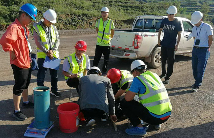 督察組進行路基實體檢測 督查組對原材料進行抽檢