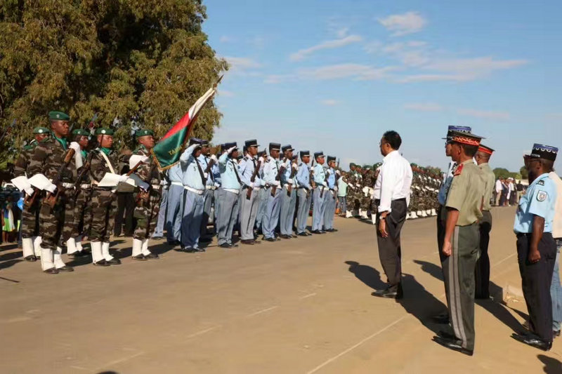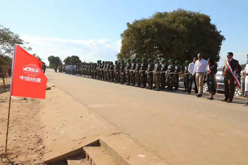 馬達(dá)加斯加三軍儀仗隊(duì)在中鐵十八局集團(tuán)承建的九號(hào)公路上列隊(duì)等待總統(tǒng)的檢閱