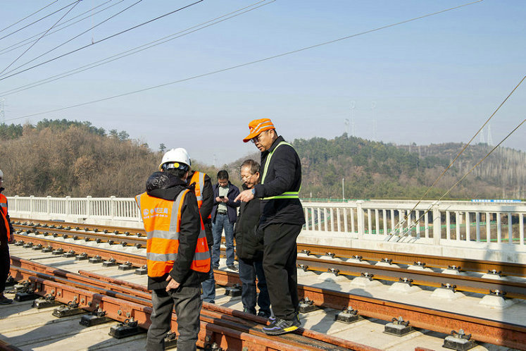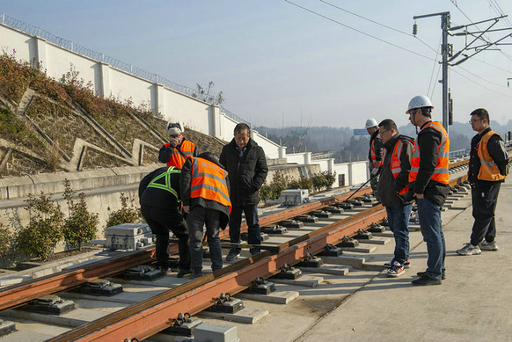 襄陽(yáng)鐵路工務(wù)段領(lǐng)導(dǎo)檢查指導(dǎo)鄭萬(wàn)高鐵南漳站道岔精準(zhǔn)精調(diào)工作在鄭萬(wàn)高鐵湖北南段南漳站襄陽(yáng)方向無(wú)砟軌道道岔施工區(qū)域,負(fù)責(zé)道岔精調(diào)的施工人員在寒風(fēng)凜冽中各行其責(zé)、工作有序。陪同襄陽(yáng)工務(wù)段領(lǐng)導(dǎo)前來(lái)檢查指導(dǎo)此次道岔精調(diào)工作的中鐵三局線橋公司鄭萬(wàn)項(xiàng)目黨支部書記戴斌介紹說(shuō),鄭萬(wàn)高鐵沿途各站道岔區(qū)分無(wú)砟軌道道岔和有砟軌道道岔,沿線有南漳站、??嫡?、神農(nóng)架站、興山站、巴東北站。道岔精調(diào)的測(cè)量精度技術(shù)要求相當(dāng)高,線路存在精調(diào)技術(shù)難度大、質(zhì)量控制精度高等施工難度。我們推行專業(yè)化施工、信息化管理、標(biāo)準(zhǔn)化作業(yè)模式,精調(diào)采取先測(cè)量軌道數(shù)據(jù),嚴(yán)格執(zhí)行現(xiàn)行的技術(shù)標(biāo)準(zhǔn)和規(guī)范,后根據(jù)幾何參數(shù)加減精調(diào)件的方案推進(jìn)。確保道岔調(diào)整時(shí)的方向和高低應(yīng)有基準(zhǔn)線,平面和高程需要調(diào)整到基準(zhǔn)線附近,建立軌道幾何狀態(tài)的統(tǒng)一數(shù)據(jù)庫(kù),并加強(qiáng)管理,確保資料的可追溯性。