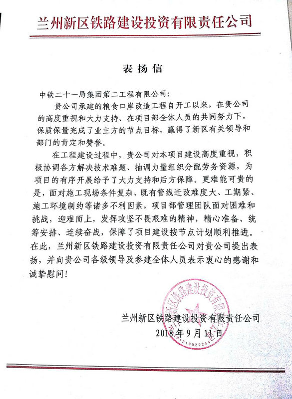 9月11日,中鐵二十一局集團二公司蘭州新區(qū)北站物流園糧食口岸項目部收到蘭州新區(qū)鐵路建設(shè)投資有限責任公司的表揚信。對項目部自開工建設(shè)以來深度參與新區(qū)“一帶一路”的建設(shè)規(guī)劃,保證項目按照既定節(jié)點目標順利實現(xiàn)作出的努力表示感謝。